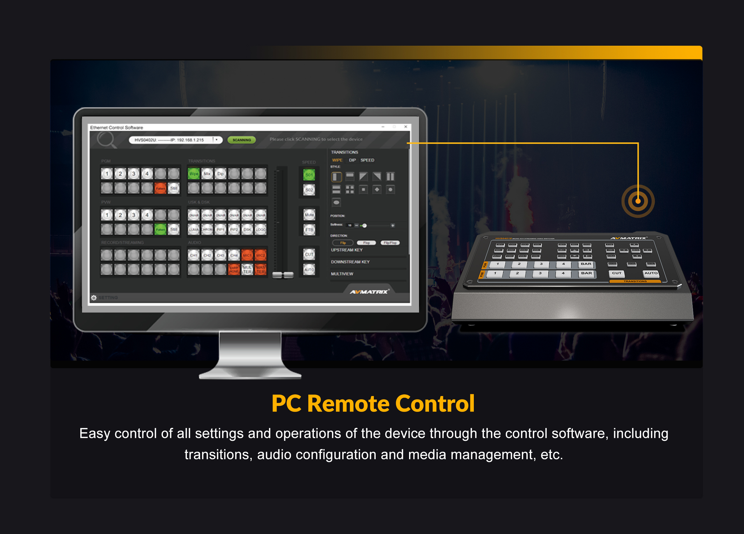 Cung cấp khả năng kiểm soát dễ dàng tất cả cài đặt và hoạt động thông qua phần mềm điều khiển, bao gồm chuyển tiếp, cấu hình âm thanh, quản lý phương tiện, v.v.