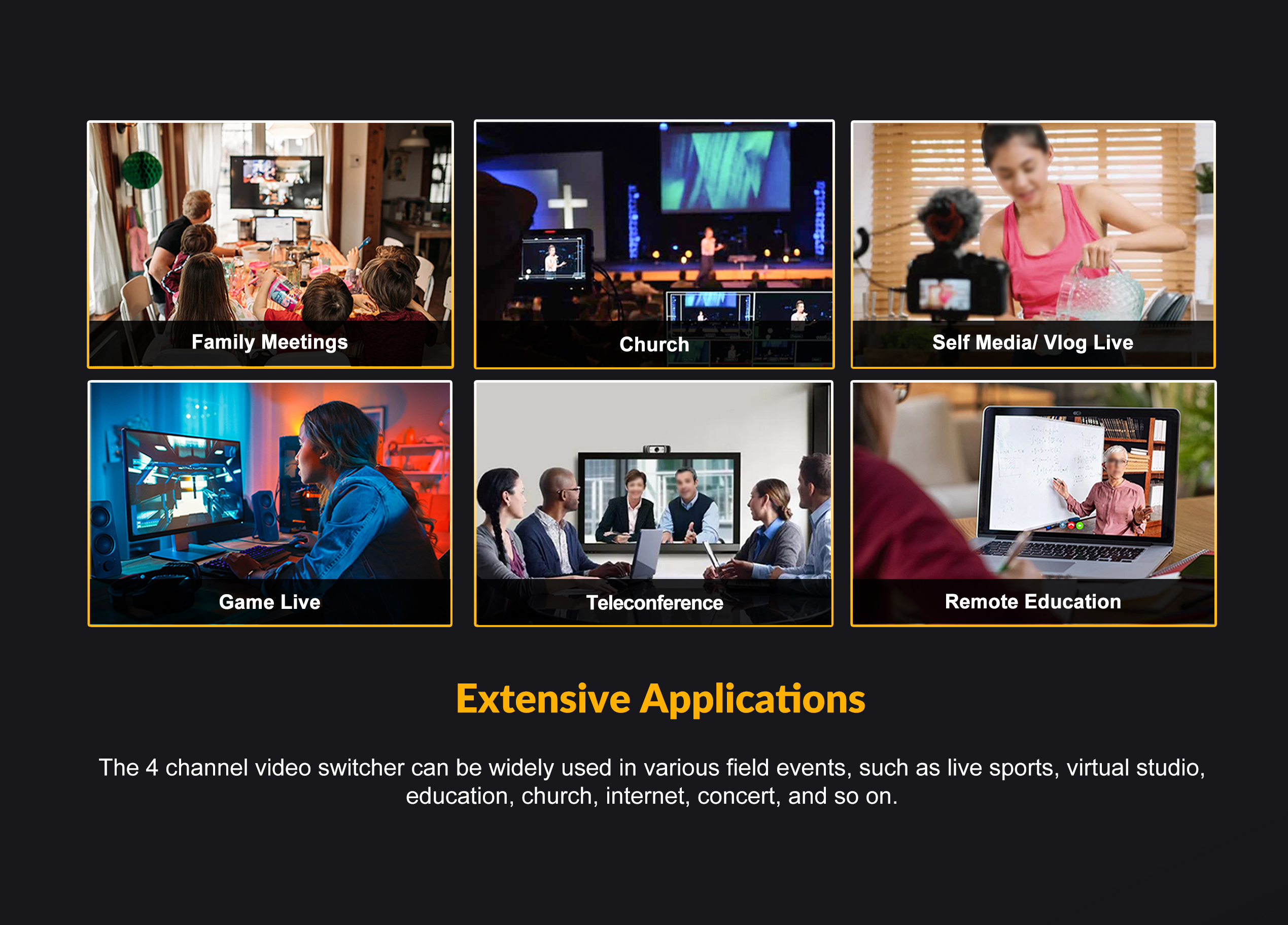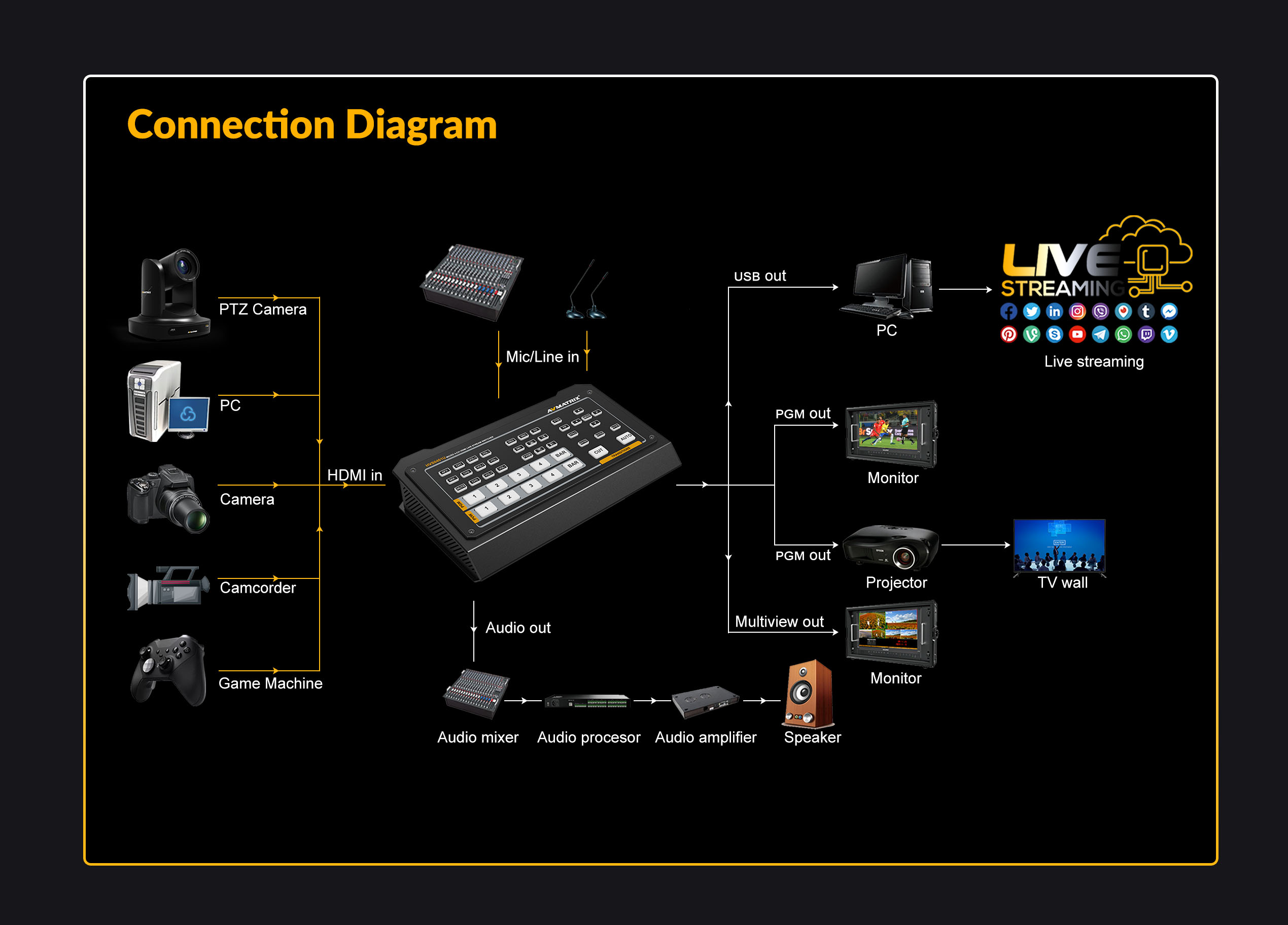 Nhiều giao diện bao gồm đầu vào HDMI và DisplayPort, đầu ra Chương trình, đầu ra nhiều chế độ xem, đầu vào âm thanh, cổng phát trực tuyến và ghi âm.