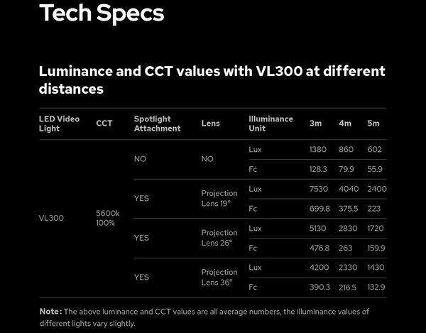 Đo quang với đèn video VL300 ở 9,8 ‘/ 3 m: