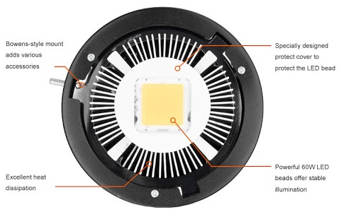 Đèn Studio Godox SL 60W sử dụng ngàm Bowens S-mount tương thích với nhiều bộ điều chỉnh ánh sáng và phụ kiện, chẳng hạn như gương phản xạ đi kèm để tạo ra chất lượng ánh sáng rộng, đồng đều và trung tính., Godox SL 60W sữ dụng nguồn điện 100-240 VAC 50/60 Hz.